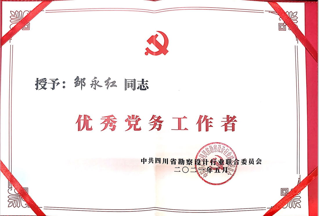 k8凯发工程设计院党支部书记邹永红同志荣获中共四川省勘察设计行业联合委员会颁发的“优秀党务工作者”荣誉称号。