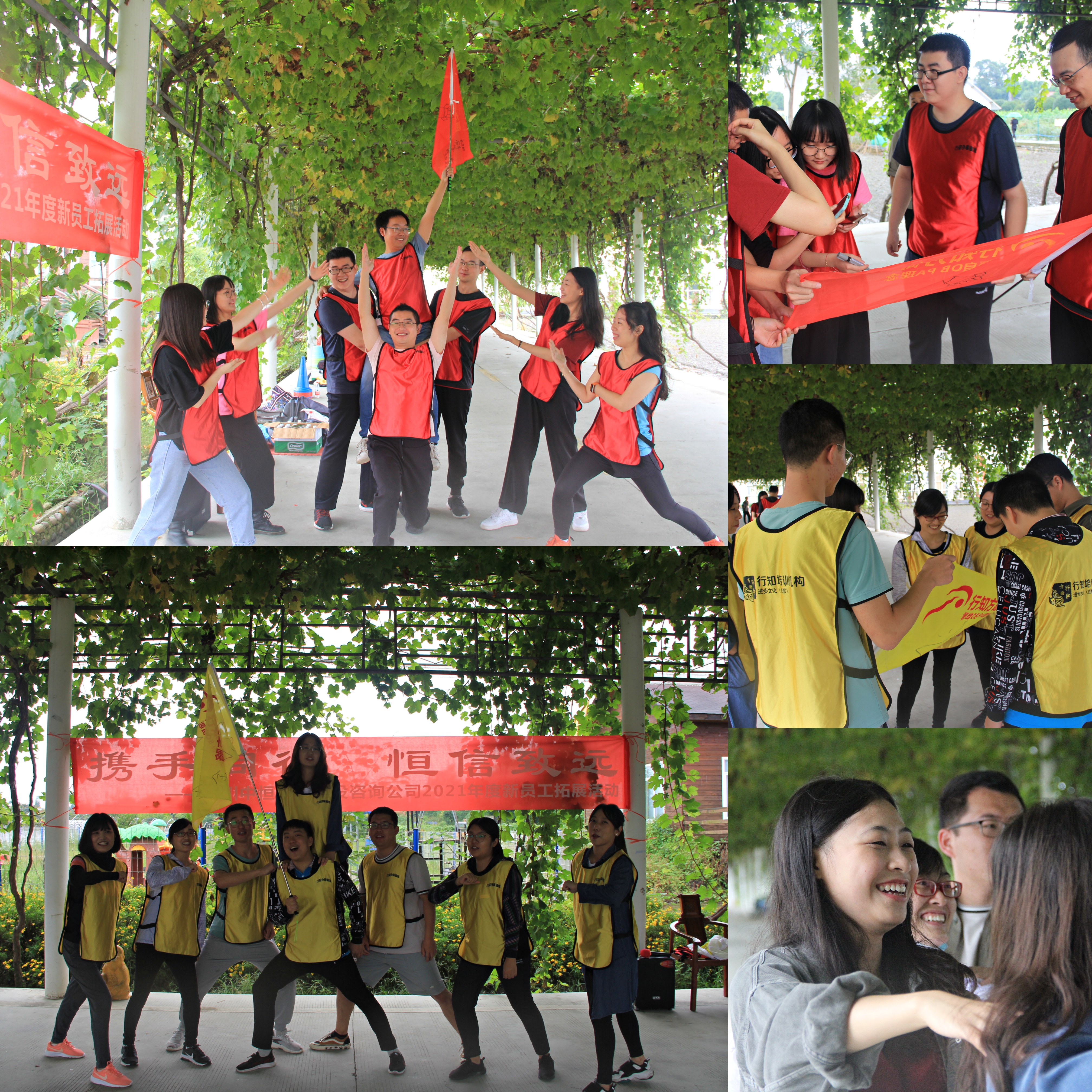 本次拓展活动共包括“快乐毛毛虫”、“企业文化价值卡”、“莱昂纳多桥”、“共绘蓝图”四个项目。在项目正式开始前,教练带领大家进行了一些热身、破冰的小游戏,增进相互间的认识,调动大家参与的积极性,引导大家转换思维,为后面项目的开展作铺垫。随后,大家开始组建团队,选队长、队秘、旗手,创作队名、队旗,编口号,并进行团队展示。本次活动的两个队伍分别为“金光闪闪队”、“火箭队”。有了前面的热身铺垫,大家都热情高涨,激情四溢,时刻准备着迎接下面的挑战。
