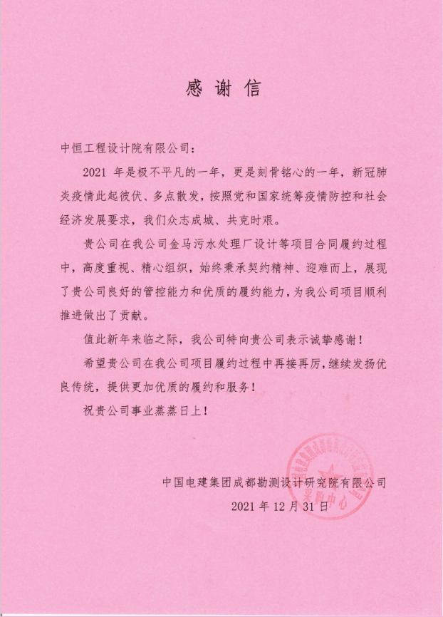 2021年12月31日,k8凯发设计院有限公司西部业务区设计研究三院收到来自中国电建集团成都勘测设计研究院有限公司的感谢信,高度赞扬了设计研究三院在金马污水处理厂等项目履约过程中“高度重视、精心组织、迎难而上”的服务精神,并对我司良好的管控能力和优质的履约能力给予了充分肯定!
