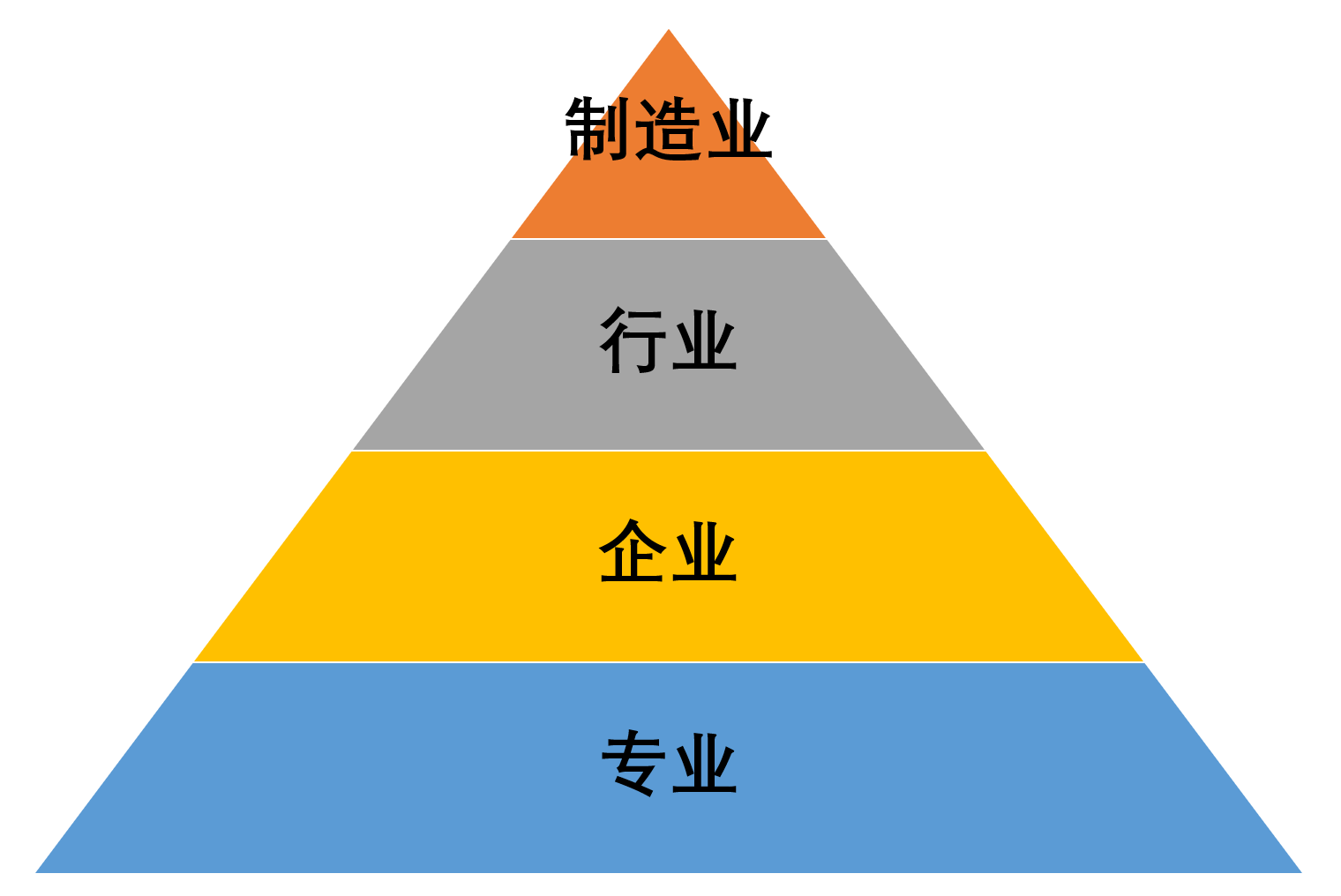 看上图的“共性知识金字塔”。从顶向下依次是制造业、行业、企业、专业,分别代表整个制造业、不同细分行业、不同制造企业、企业中不同专业与岗位,这是一个共性知识(是指具有通用或者对他人有价值的知识及关联信息等)密度不断增加的过程,反之,从下向上是一个不断减少的过程。