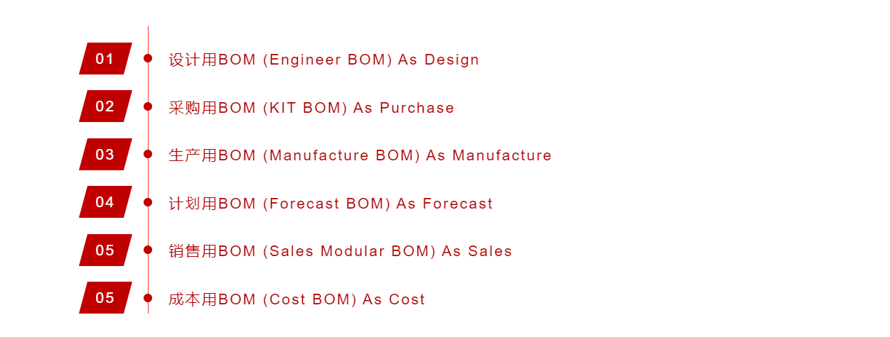 BOM(物料清单)是运行ERP系统的主导文件,企业各个业务部门都要依据统一的物料清单进行工作。它是接受客户定单、确定装配零件、计算累计提前期、编制生产与采购计划、配套领料、跟踪物流及生产过程、追溯任务来源、计算成本、投标报价、改进产品设计等都要参照的重要文件。因此物料清单的准确性要求很高。