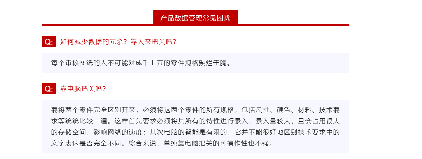 为什么会出现这种情况呢?作为一名设计人员,每当设计新产品时,他也希望能够从现有的物料中选择能够满足其设计要求的零件。但他很快会发现,面对庞大的数据库,在成百上千的零件图纸中寻找可以借用的物料,无异于大海捞针,最终的结果还可能是一无所获。这在很大程度上降低了设计人员的工作效率和工作热情,最终他们就会考虑不理会原有的物料,将所有零件全部重新设计。这样的话,不可避免会造成一些数据的雷同(冗余),而且会象滚雪球一样越滚越大。若干年后,当我们想要将它们缩编出来时,它们已经盘根错节地交杂在各类生产指导文件中;而那些可预见到的对生产秩序的影响,将会使我们不敢轻举妄动。