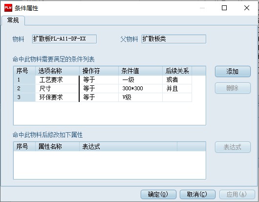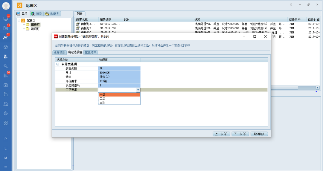通过建立产品族实现产品结构的固化及规范化,同时对每一个物料在选型时的命中条件加以设置,限定在选取某一个物料后,剩余物料的可选范围控制。