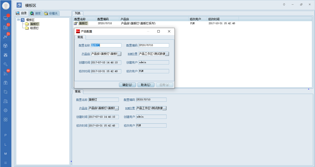 建立规划且完成的产品族库后,通过对产品系列及产品类型的划分,形成常用的配置模板,配置模板同时关联产品族、BOM位置、配置编码等信息,便于后期引用过程快速产生所需数据。