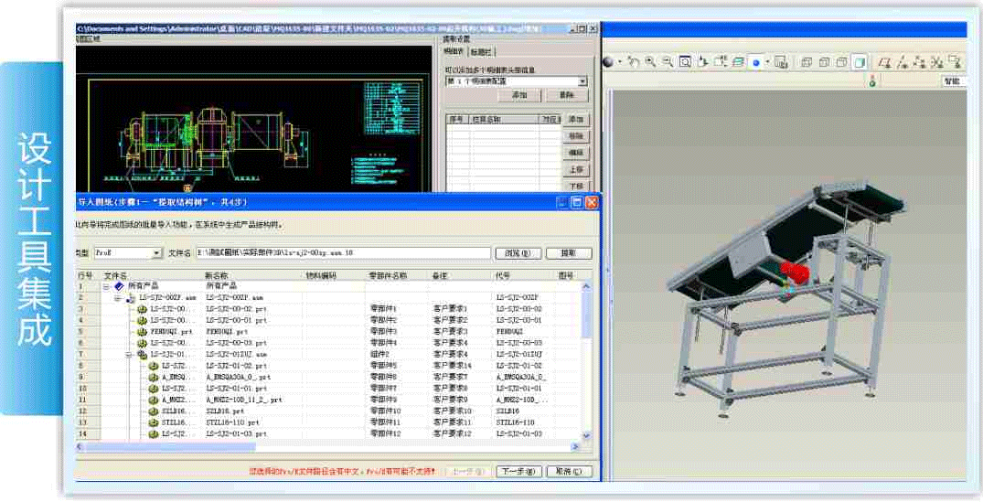 ●对整套已完成的产品Autocad或ProE图纸进行产品结构分析,直接生成多层产品明细表(产品BOM),并保证图纸修改后,对应零部件的信息自动同步更新。