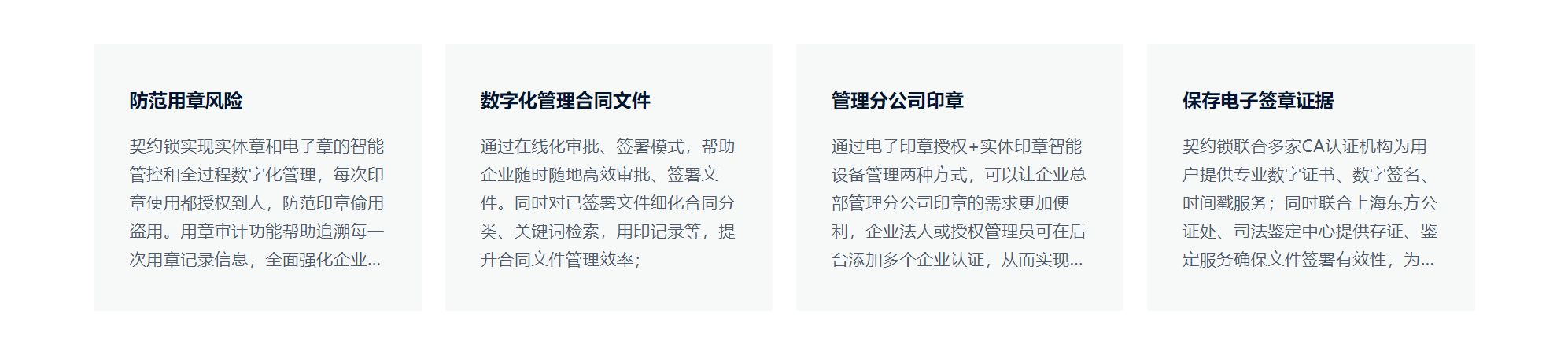 方便组织进行电子化签约、实体用印安全控制及分子机构用印的授权管理等,助力企业实现纸质和电子签约文件的统一管理